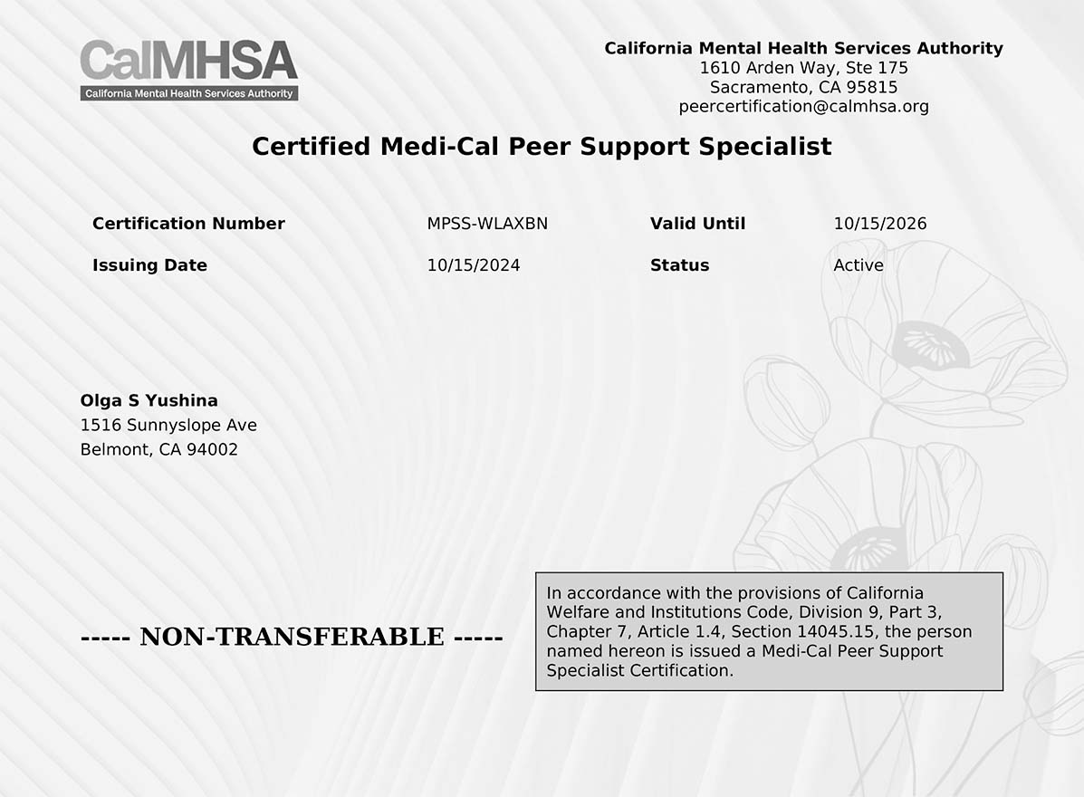 Our Executive Director, Irina Pudovinnikova, holds a Master’s degree in Inclusive and Special Education and has completed the Applied Behavior Analysis Basic Series through the Verified Course Sequence at the Florida Institute of Technology. Olga Yushina is a Certified Medi-Cal Peer Support Specialist. Together, we use our expertise in behavioral science, inclusive education, and peer support to deliver individualized services in English and Russian.